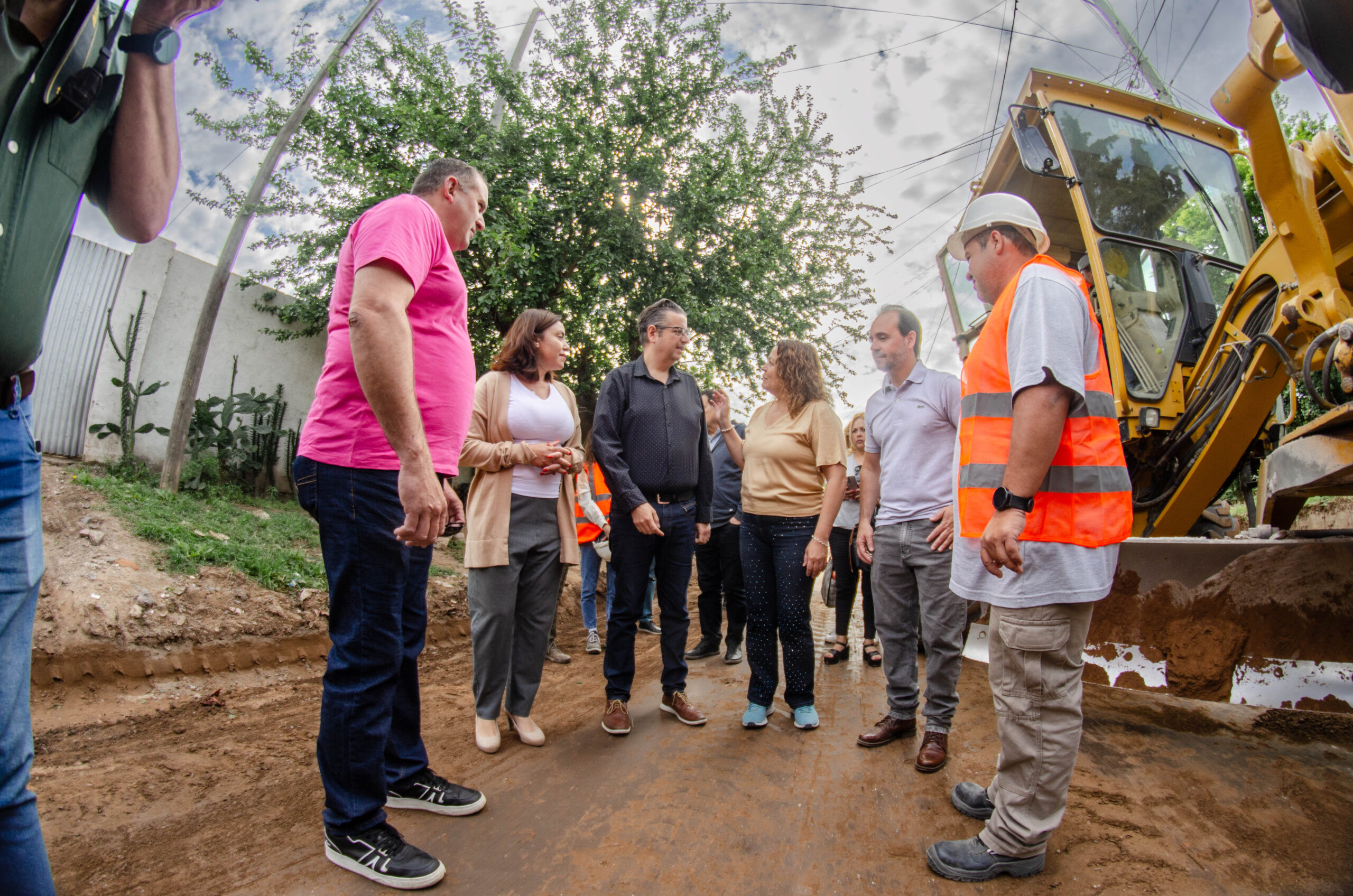 Inicio de obras de pavimentación, cordón cuneta y desagües sobre las calles Pringles esquina Sabattini de Saldán, Barrio Portón de Piedras) y Macha (Córdoba, Villa Rivera Indarte), la misma calle que separa ambas ciudades.