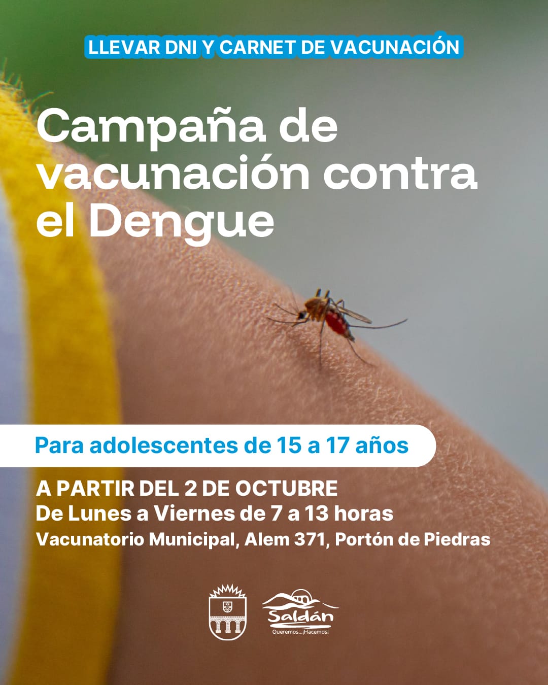Campaña de Vacunación contra el Dengue para adolescentes de 15 a 17 años, a partir del 2 de Octubre. - Lunes a Viernes de 7 a 13hs - Vacunatorio Municipal - Alem 371 - Portón de Piedras